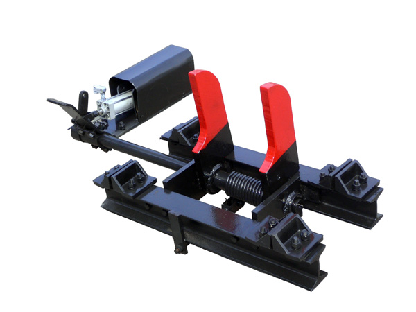本实用新型公开了一种气动阻车器,包括刀挡、扭簧、力把、气缸、轴架、轴、限位板和拉杆,轴架固定在限位板上,轴的远端穿过扭簧铰接在轴架上,刀挡固定在轴上并与扭簧上端连接,扭簧下端固定在拉杆上,力把下端固定在轴的近端,力把上端与气缸铰接。该气动阻车器结构简单,安全可靠,可以人工控制,也可以远程控制,实现集中自动化管理。